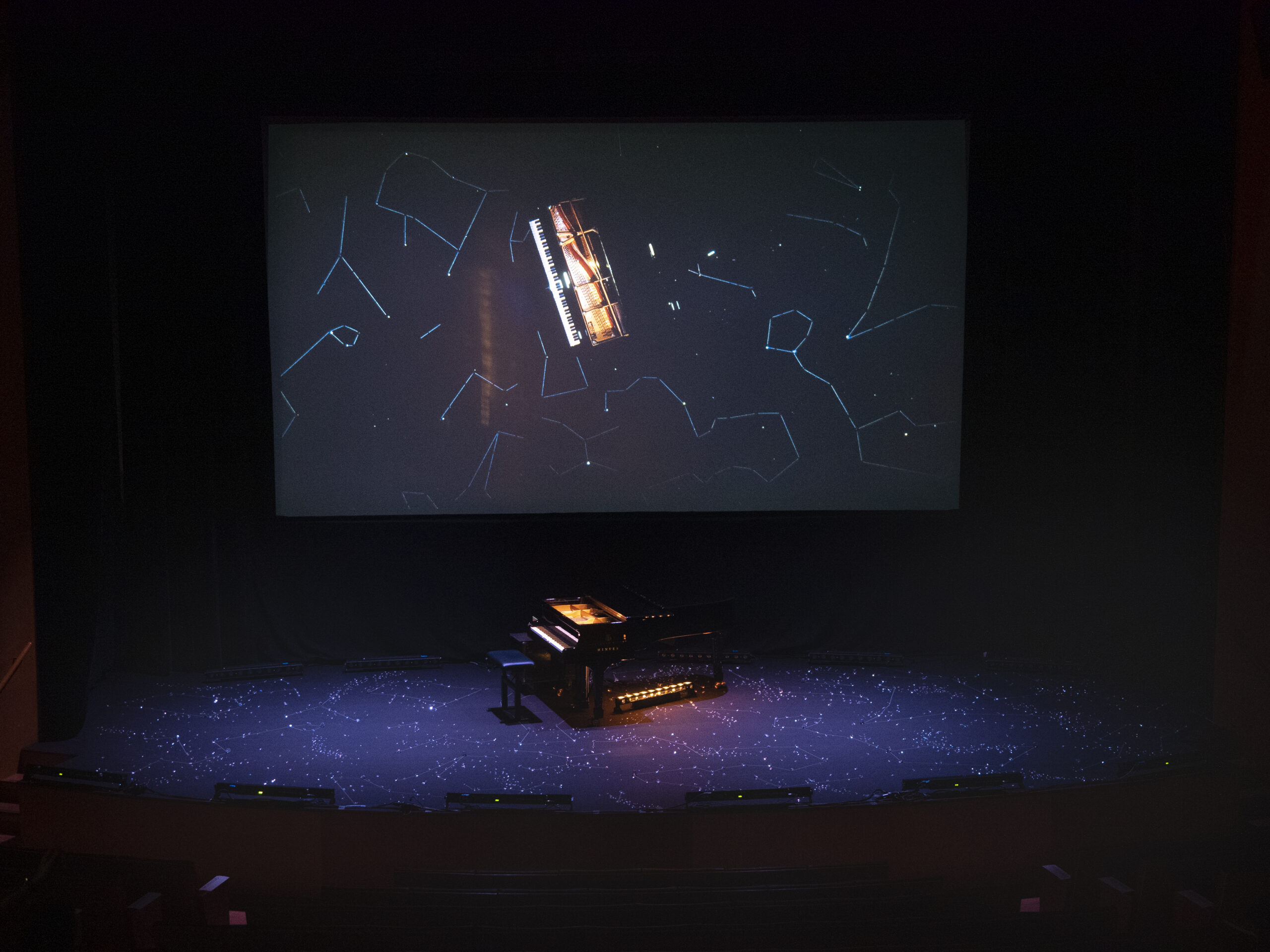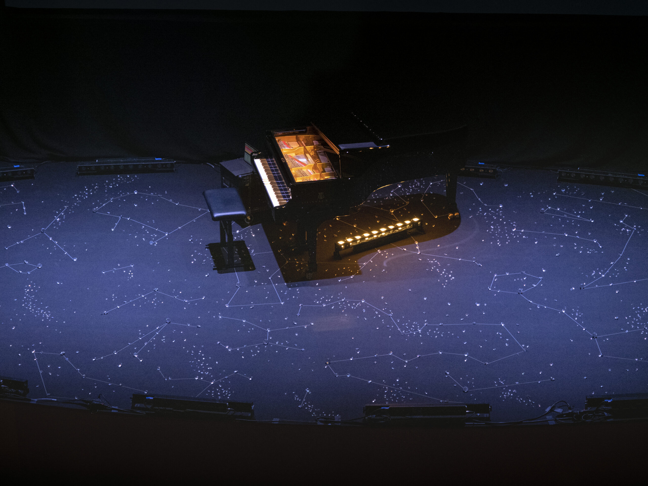 Francesco Tristano interpreted the 20-minute piece on the piano only once, and it then resonates in the memory of the instrument, no longer with the pianist present, as if only the structure of dreams remained, which are built with 7000 recycled crystals.